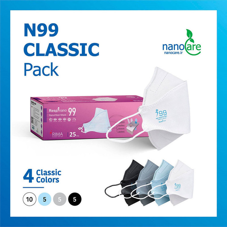 ماسکهای سه بعدی سایز نوجوان-متوسط طرح کلاسیک شامل 10 عدد سفید، 5 عدد آبی روشن، 5 عدد طوسی و 5 عدد مشکی در یک جعبه(مجموعا 25 عدد) می باشد و از سری ماسک های پر طرفدار در سطح دنیا می باشند که به دلیل ظاهر منحصر به فرد خود علاوه بر ظاهر زیبا کارآیی بسیار بالایی به ماسک می دهد، ماسک تولید شده توسط شرکت تولیدکننده در کلاس N99 بدون سوپاپ از نظر عملکرد به دام اندازی و افت فشار همانند ماسکهای FFP3 و KF99 هستند. این ماسکها حاوی دو لایه نانوالیاف در بین لایههای محافظ خود هستند. این ماسکها به دلیل ظاهر ویژهای که دارند در مقایسه با ماسکهای پزشکی نانو، نشت کمتری داشته و از تنفسپذیری بهتری برخوردارند.