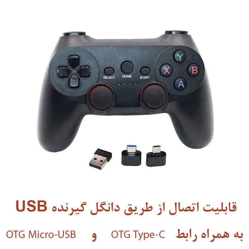 دسته بازی مدل 2.4G-PAD یک دسته بازی با فناوری بیسیم می باشد که با استفاده از آن می توانید به راحتی به کامپیوتر ، لپ تاپ ، تبلت ، موبایل یا حتی مدلهای TV Box متصل شده و از آن استفاده کنید. کیفیت ساخت بدنه و کلید های این گیم پد از متریال بسیار با کیفیت می باشد. به همراه این گیم پد فوق العاده ، شما یک دانگل گیرنده USB و یک عدد رابط OTG Micro-USB و یک عدد رابط OTG Type-C دریافت خواهید کرد که معمولا در محفظه باتری دستگاه قرار دارد. با استفاده از این دانگل ها اتصال به انواع موبایل و تبلت به راحتی حاصل خواهد شد.