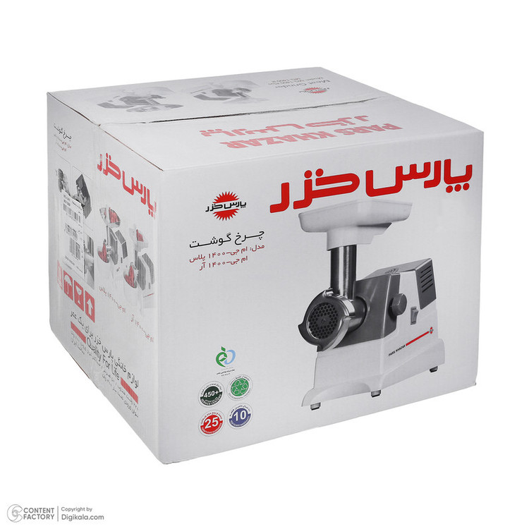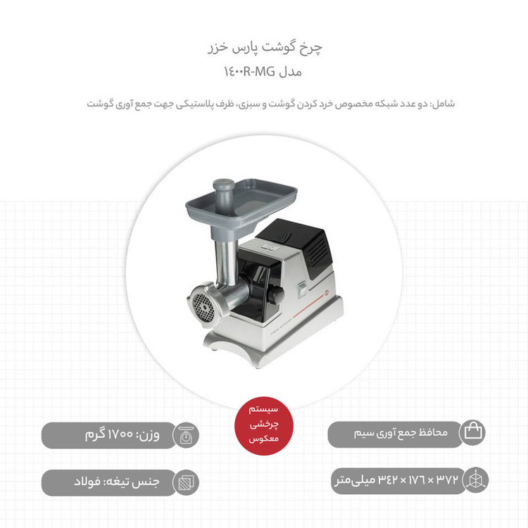 خوشبختانه شرکت وطنی پارس خزر به عنوان شرکتی ایرانی که محصولاتی با کیفیت تولید میکند به خوبی در میان مردم جا افتاده است. اگر از آن دسته افراد هستید که هنوز با عینک بدبینی به تولیدات داخل کشور نگاه میکنید پیشنهاد میکنیم یکی از محصولات پارس خزر را استفاده نمایید تا دیدتان نسبت به محصولات ساخت ایران به کلی تغییر کند. MG-1400R یکی از انواع چرخ گوشت پارس خزر است که به موتوری 700 واتی مجهز شده است. این موتور خروجی 1.2 کیلوگرم گوشت در دقیقه را برای این مدل امکان پذیر کرده است. طبق اطلاعاتی که در صفحه این محصول در سایت رسمی این شرکت موجود است به همراه این مدل ظرف جمع آوری گوشت، دو شبکه با سایزهای متفاوت و همچنین سری سوسیس ساز نیز به خریدار عرضه میشود. این مدل در رنگهای سفید، طوسی، مشکی و نقره ای به بازار عرضه شده است.