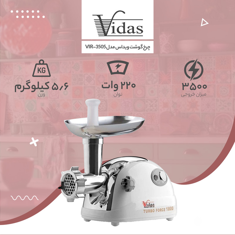 چرخ گوشت ویداس مدل VIR-3505 محصولی کارامد با بدنه استیل و پلاستیک، پذیرای موتوری با توان 1800 واتی است که می توان به کمک آن به راحتی عملیات چرخ کردن گوشت و یا مواد غذایی را با حجم بالا ظرف چند دقیقه انجام داد. ویداس جهت افزایش کارایی برای این مدل سه دیسک با سه سایز ریز، متوسط و درشت در نظر گرفته تا بتوان متناسب با نیاز گوشت ها را چرخ کرد. کلید هایی جهت روشن / خاموش کردن و سیستم چرخش معکوس بر روی چرخ گوشت قرار دارد که دسترسی به آنها آسان می باشد. لازم به توضیح است، این سیستم از گیر کردن مواد غذایی در محفظه داخلی، هنگام چرخ کردن جلوگیری می کند. همراه با چرخ گوشت Vidas VIR 3505 قطعه سوسیس ساز نیز ارائه گردیده و برای تهیه سوسیس های خانگی و سالم بسیار ایده آل می باشد.