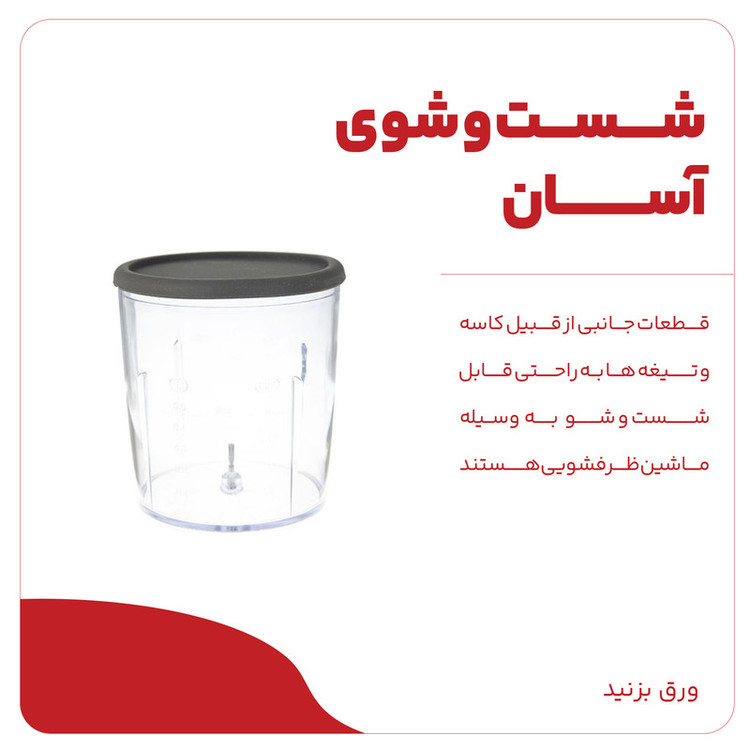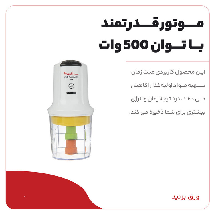 اگر قصد تهیه لوازم آشپزخانه را دارید، حتما با خرد کن مواجه شدهاید. خردکن کارایی بسیاری دارد. خردکنهای برقی دستگاههایی جمع و جور، سبک وزن و دستیاری خوب در آشپزخانه هستند که با راحت تر نمودن پروسه خردکردن مواد غذایی موردنیاز در تهیه سریع غذا کارایی دارند. اگر قصد تهیه خردکن دارید، خردکن مولینکس مدل AT723110 یکی از گزینههایتان است. این مدل در ابعاد 105 × 105 × 260 میلیمتر و وزن 0.950 کیلوگرم به بازار عرضه شده است. این طراحی سبب شده تا این مدل فضای زیادی اشغال نکند. ریز کردن سبزیجات و میوه جات و… در سایز کوچک و بزرگ. هر چه زمان بیشتری از دستگاه برای خرد کردن استفاده کنید مواد غذایی ریزتر می شوند. این محصول کاربردی مدت زمان تهیه مواد اولیه غذا را کاهش می دهد، درنتیجه زمان و انرژی بیشتری برای شما ذخیره می کند. توانی که برای این مدل در نظر گرفته شده 500 وات است. تیغه این محصول 4 پره است. تعداد تنظیمات سرعت این مدل 2 حالت است.