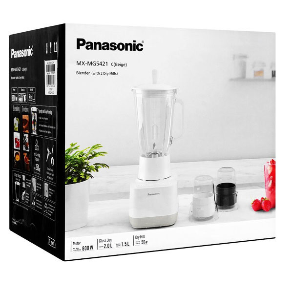 مخلوط کن دوکاره پاناسونیک مدل MX-MG5421 با طراحی ساده و شکیل به رنگ سفید/بژ عرضه می گردد. این محصول که توسط برند مطرح و معتبر panasonic تولید می شود از کیفیت ساخت بالایی برخوردار بوده و طول عمر زیادی را می توان برای آن متصور شد. قسمت بدنه از پلاستیک مستحکم و پارچ مخلوط کن از شیشه مقاوم و بادوام ساخته شده است.