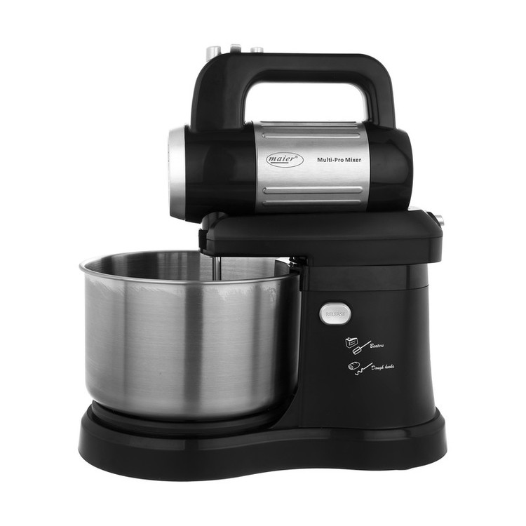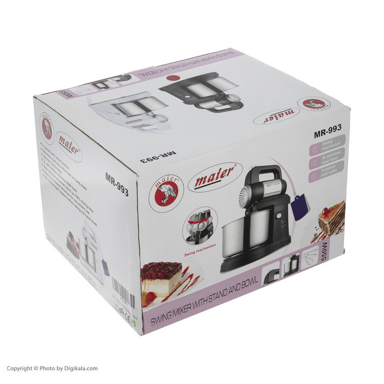 همزن کاسه دار حرفه ای مایر مدل MR-993 که دارای یک موتور سنگین 550 واتی قدرتمند می باشد که از پس تمام کارهایی که از یک همزن حرفه ای انتظار دارید به راحتی برمیاید.این همزن دارای بدنه ای از جنس استیل+پلاستیک فشرده می باشد و کاسه و پره های آن تماما از استیل ضد زنگ ساخته شده است.برای این همزن 5 سرعت مختلف برای انجام کارهای متفاوت در نظر گرفته شده است و همچنین حالت توربو نیز برای زمانی که میخواهید از حداکثر توان موتور بهره ببرید نیز وجود دارد.ویژگی خاص این محصول چرخش همزمان کاسه و همزن به صورت برعکس هم است که باعث می شود مواد غذایی به بهترین حالت ممکن مخلوط شود.همزن کاسه دار مایر مناسب برای آشپزی-کیک پزی و امور حرفه ای شیرینی پزی بوده و با داشتن انواع ابزارهای هم زدن مخصوص خمیر و کیک و... می تواند نیازهای شما را مرتفع کند.قطعات این محصول به آسانی از هم جدا می شوند و برای شستوشوی دستگاه هیچ دغدغه ای نخواهید داشت.این محصول دارای پایه ضدلغزش می باشد که مانع از کوچکترین تکان در همزن می شود که البته موتور این دستگاه در کنار قدرت بالا دارای صدای کم و بدون لرزش می باشد.دکمه اجکت نیز هم برای جداسازی همزن و هم برای جداسازی کاسه در نظر گرفته شده است که به راحتی از پایه جدا می شوند و همچنین شما می توانید از این همزن به عنوان همزن دستی نیز استفاده کنید.