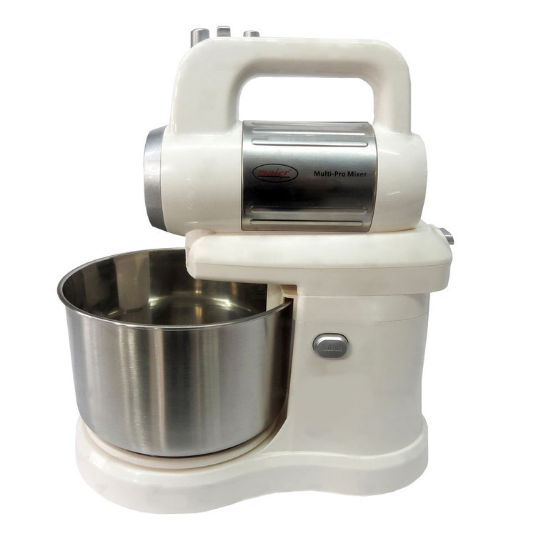 همزن کاسه دار مایر مدل MR-993 یکی از ابزارهای کاربردی آشپرخانه های امروزی است. این همزن کاربرد خانگی داشته و در دسته همزن های نیمه حرفه ای قرار میگیرد. معمولا همزن های برقی خانگی در نوع کاسه دار و بدون کاسه هستند. همزن مایر مدل 993 دارای ویژگی منحصر به فردی است " کاسه استیل چرخان و در عین حال امکان گردش به چپ و راست سر دستگاه ". همچنین همزن مایر قابلیت استفاده بدون کاسه و با کاسه را داراست ، شما میتوانید بسته به نیاز خود سر همزن را از پایه جدا کرده و بصورت یک همزن برقی دستی بکار بگیرید. این همزن برقی دارای موتور با سیستم سرعت 1 تا 5 است. در عین حال وجود کلید توربو امکان ایجاد سرعت لحظه ای را برای شما فراهم میسازد. در روی دستگاه یک شاسی فشاری برای خارج کردن میله های همزن وجود دارد.جنس کاسه ساخته شده در این مدل از استیل بوده و خانمهای خانه دار دیگر دغدغه رنگ گرفتگی ظرف همزن را نخواهند داشت. کاسه استیل با قطر حدودی 18 سانتیمتر و عمق 10 سانتیمتر از استحکام قابل قبولی برخوردار است. درون بسته بندی دستگاه یک عدد کاردک برای نظافت و جمع کردن مواد درون کاسه وجود دارد. همچنین دستگاه دو نوع میله متفاوت دارد.