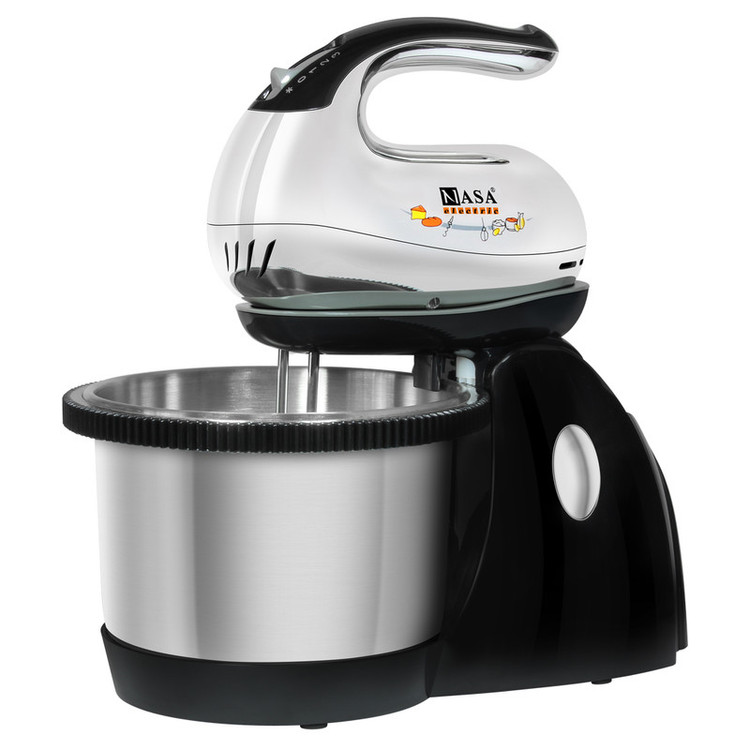 همزن ناسا الکتریک مدل NS-919 یکی از محصولات کاربردی و با کیفیت این برند محسوب میشود. این میکسر کاسه دار بوده که ظرفیت آن حداکثر 3 لیتر و از جنس استیل ضد زنگ میباشد و از مقاومت بسیار بالایی نیز برخوردار است. از این رو میتواند انتخاب مناسبی برای هر خانه و آشپزخانهای باشد. این دستگاه به دلیل داشتن موتوری قدرتمند و بدنه محکم قابلیت تهیه انواع خمیر، هم زدن انواع مواد غذایی مختلف و... را دارد. از دیگر ویژگیهای منحصر به فرد این همزن میتوان به امکان چرخش سه بعدی کاسه به صورت اتوماتیک اشاره کرد. همزن کاسه دار NS-919 قابلیت تنظم سرعت در سه سطح کم، متوسط و زیاد را دارد که میتوانید از درجه کند دستگاه برای هم زدن مخلوط در ابتدا و انتهای کارتان و یا برای استفاده در دسرهایی که نیازمند مخلوط سازی با دور کند هستند استفاده کنید، از دور متوسط آن برای آماده سازی مخلوطهایی که نیاز به زمان زیادتر برای مخلوط سازی دارند مانند سس مایونز و یا برخی از دسرها استفاده نمایید، با کمک دور تند دستگاه یک سفیده تخم مرغ پف کرده را برای انواع کیکهای پوک با پف زیاد آماده کنید. همزن کاسه دار ناسا الکتریک دارای دو سری همزن و خمیرزن میباشد. این میلهها از جنس استیل ضد زنگ با روکش کروم بوده و از کیفیت مطلوبی بهره میبرند. میلهی خمیرزن برای ورز دادن خمیر و میلهی همزن برای زدن سفیده تخم مرغ، خامه، انواع سس، مایهی کیک و … مورد استفاده قرار میگیرد.