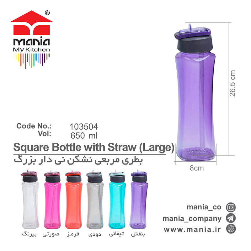 این محصول که دارای درِ پیچی و دهانه خروجی آب فشاری بوده نشکن می باشد و مناسب جهت استفاده در باشگاه ورزشی، مدرسه و دانشگاه، مسافرت، پیک نیک و... است. همچنین حداکثر دمای مجاز برای این بطری ها 70 درجه سانتی گراد بوده و حجم این سایز از محصول 650 میلی لیتر است.