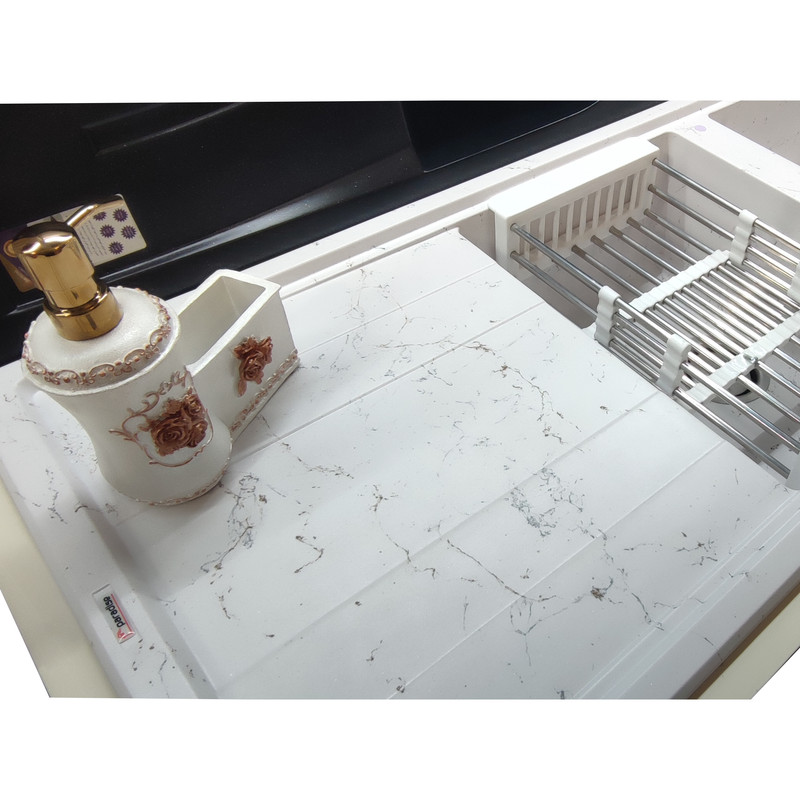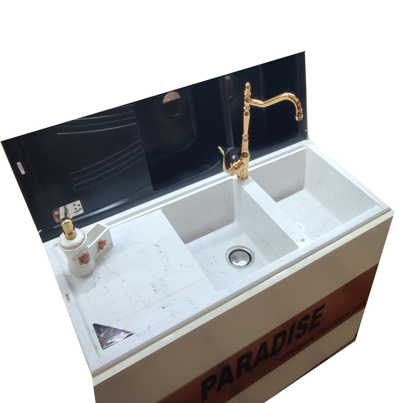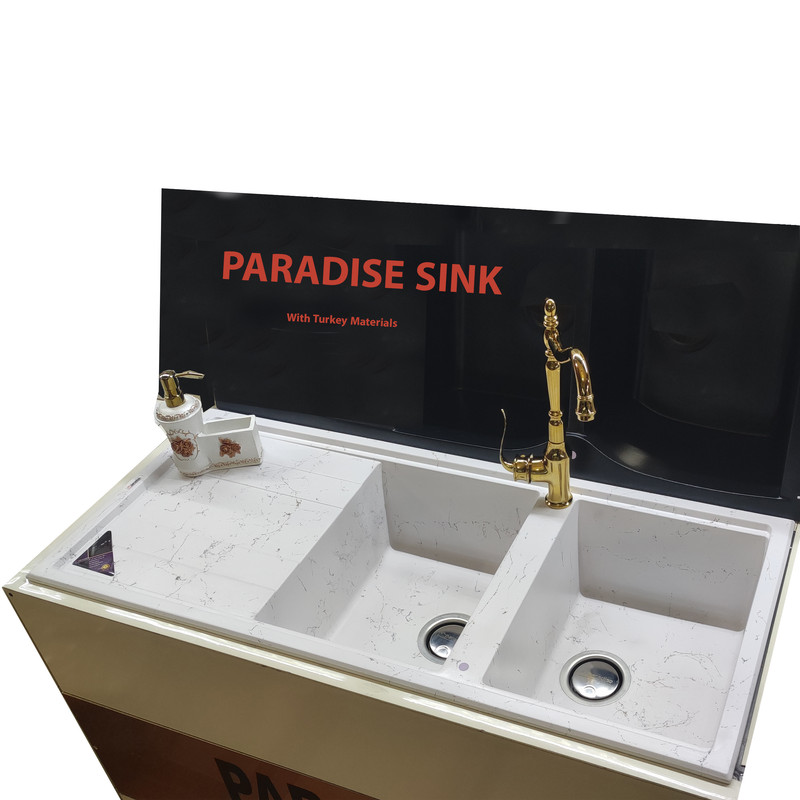 سینک گرانیت پاردایز مدل TURKEY-214-White-GS به رنگ سفید و رگه های زیبایی از رنگ نقره ای و طلایی از پرفروش ترین و مورد پسند ترین طرح های سینک گرانیت می باشد. این کارخانه به دلیل همجواری با کشور ترکیه بیشتر مواد اولیه خود را از این کشور تامین می کند. به همین دلیل کیفیت آن قابل رقابت با تولیدات مشابه خارجی می باشد .سینک های گرانیتی پارادایز با الگوبرداری از تکنولوژی روز آلمان و سینک های شاک زیر نظر مجرب ترین پرسنل تولید می شود . این سینک ها تمام مراحل تست کیفی را در چندین مرحله سپری می کنند . تا مشکلی برای یک عمر استفاده نداشته باشد. سینک های پارادایز با مواد اولیه ترک تولید شده و در رویه سینک ها از مواد آلمانی استفاده می شود. این سینک ها در چندین نوبت و با درجه دمایی متفاوت در معرض پخت قرار می گیرد تا مقاومت آن بالا رود . سینک ها ضد خش ، آنتی باکتریال می باشد . برخلاف سینک های استیل رسوب نمی بندد و هر لحظه می توان با ترکیب جوش شیرین و آب داغ و کمی پودر لباس شویی مثل روز اول تمیز و براق گردد.این سینک ها آنتی باکتریال و ضد لک بوده و می توان با خیال راحت از انواع شوینده ها مثل سفید کننده استفاده کرد.همینطور سینک ها به همراه یک سبد میوه شور عرضه می شود .پس از خرید به راحتی از جای لیبل های مشخص شده با دریل و گردبر 3.6 می توانید متناسب با راست لگن و یا چپ لگن بودن سوراخ کنید.عمق سینک 20 سانتی متر،عرض آن 50 سانتی متر و طول آن 114 سانتی متر می باشد.تمام تولیدات این شرکت دارای گواهینامه های ISO9001 می باشد.