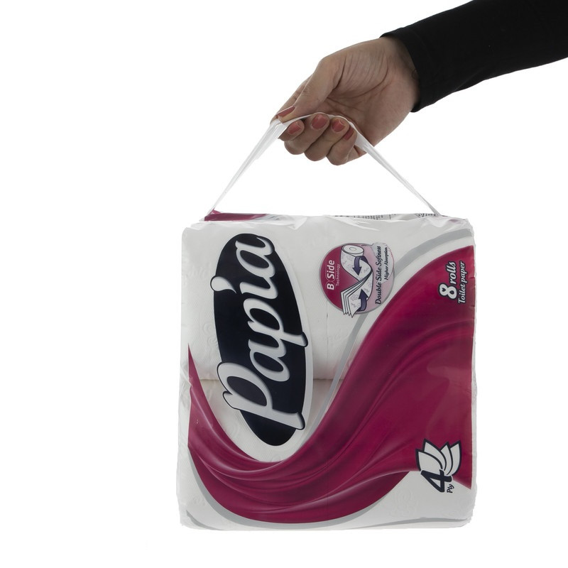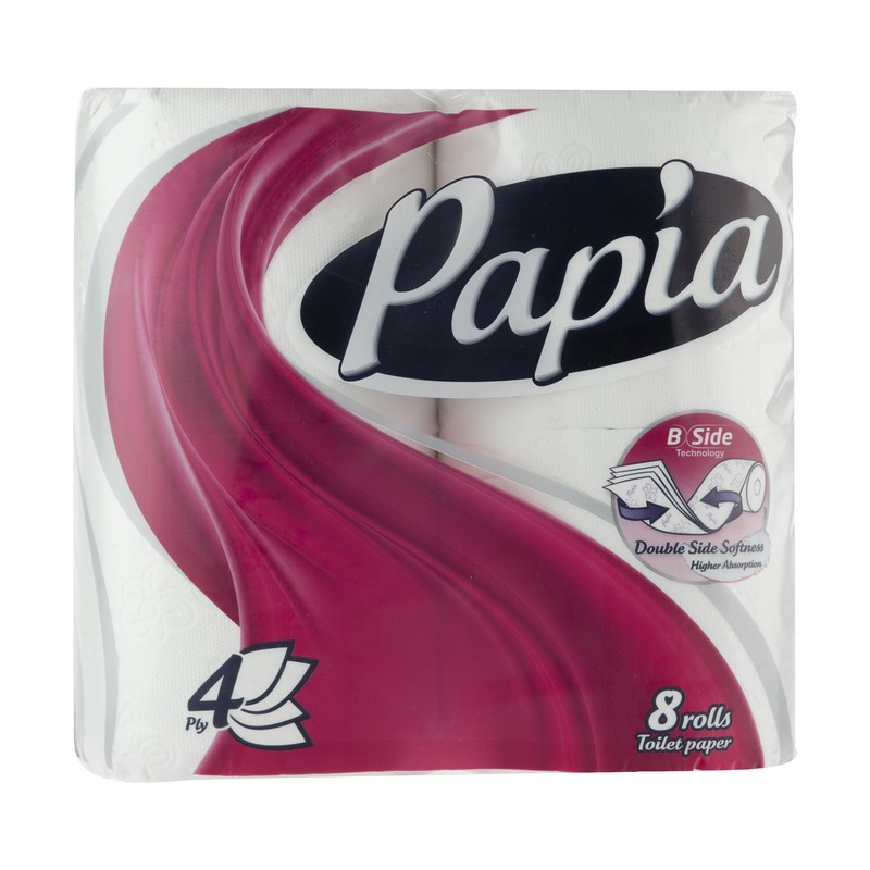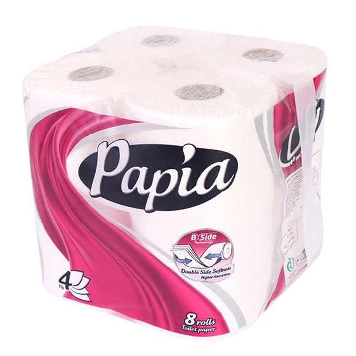 دستمال توالت پاپیا از جنس الیاف صددرصد پنبه تهیه شده، دارای 4 لایه در بسته های 8 عددی تولیدشده و طول هر رول 18.5 متر است.از ویژگی های اصلی این محصول می توان به قدرت جذب بالا، لایههای منسجم و مقاوم، وزن سبک، نرم و ضد حساسیت بودن دستمال اشاره کرد.دستمال توالت پاپیا فاقد پرز، الیاف خرد شده، سوراخ و اجسام خارجی بوده و با بالاترین استانداردها تولید شده است.این محصول با استفاده از مواد اولیه مرغوب و ماشین آلات تمام اتوماتیک در شرایط کاملا بهداشتی و بدون دخالت دست تولید می شود.