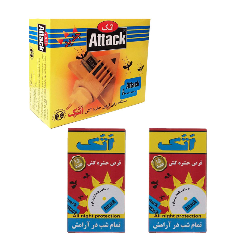 این پک شامل یک عدد دستگاه حشره کش برقی اتک، و دو عدد بسته 15 عددی قرص حشره کش اتک است.